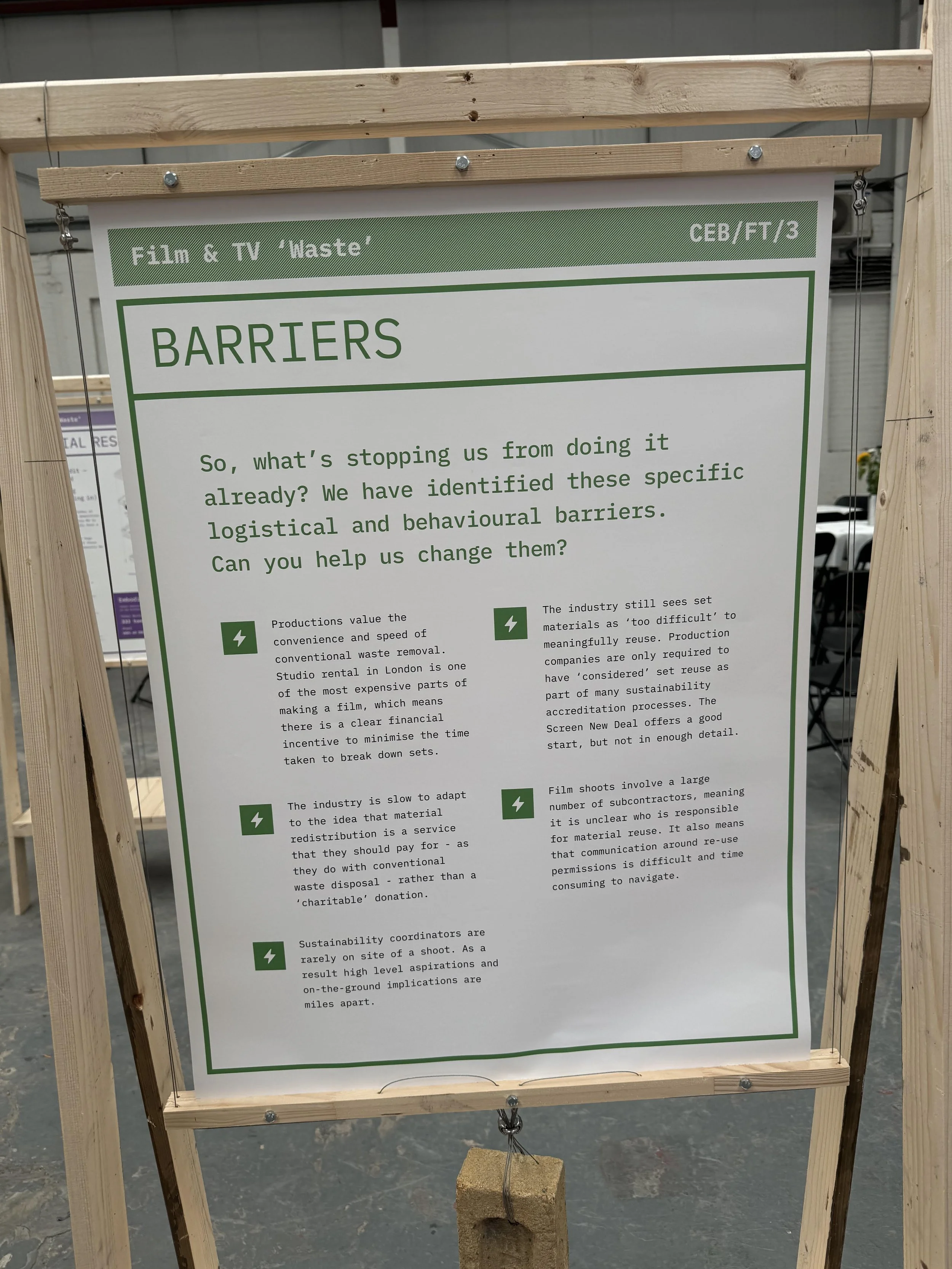 I had the opportunity to speak with Freya from Recollective, who has been working tirelessly to create more circular systems within the film and set-build industry. Recollective offer a service to take away, process, and re-distribute film sets after their useful life. Again this is work that requires a lot of time and care for the materials that are being saved. One of the big issues we discussed is the challenges around how companies value the services they are providing, as well as the need for a budget to be assigned to end of life processes at the very start of these large set builds.